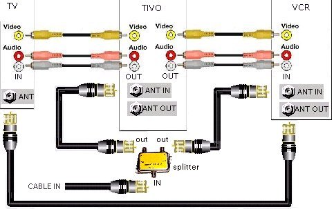 Conectando o TiVo ao VCR (videocassete) e a TV A configuração de cabos mostrada abaixo permite que você continue usando seu videocassete como já fazia antes, porém também permite o uso do seu TiVo.  Na configuração acima fazemos o TiVo e o VCR receberem o a TV a cabo pois dividimos o sinal de entrada usando um splitter. Assim, além de todo uso normal de um TiVo e um VCR você ainda pode salvar o conteúdo gravado no Tivo para um VCR (outra característica magnífica do TiVo) para desocupar espaço no HDD ou compartilhar com um amigo um programa gravado no TiVo. Veja as conexões disponíveis nos dois TiVo que funcionam no Brasil.  Conexões do painel traseiro do TIVO Series 1  Conexões do painel traseiro do TIVO Series 2